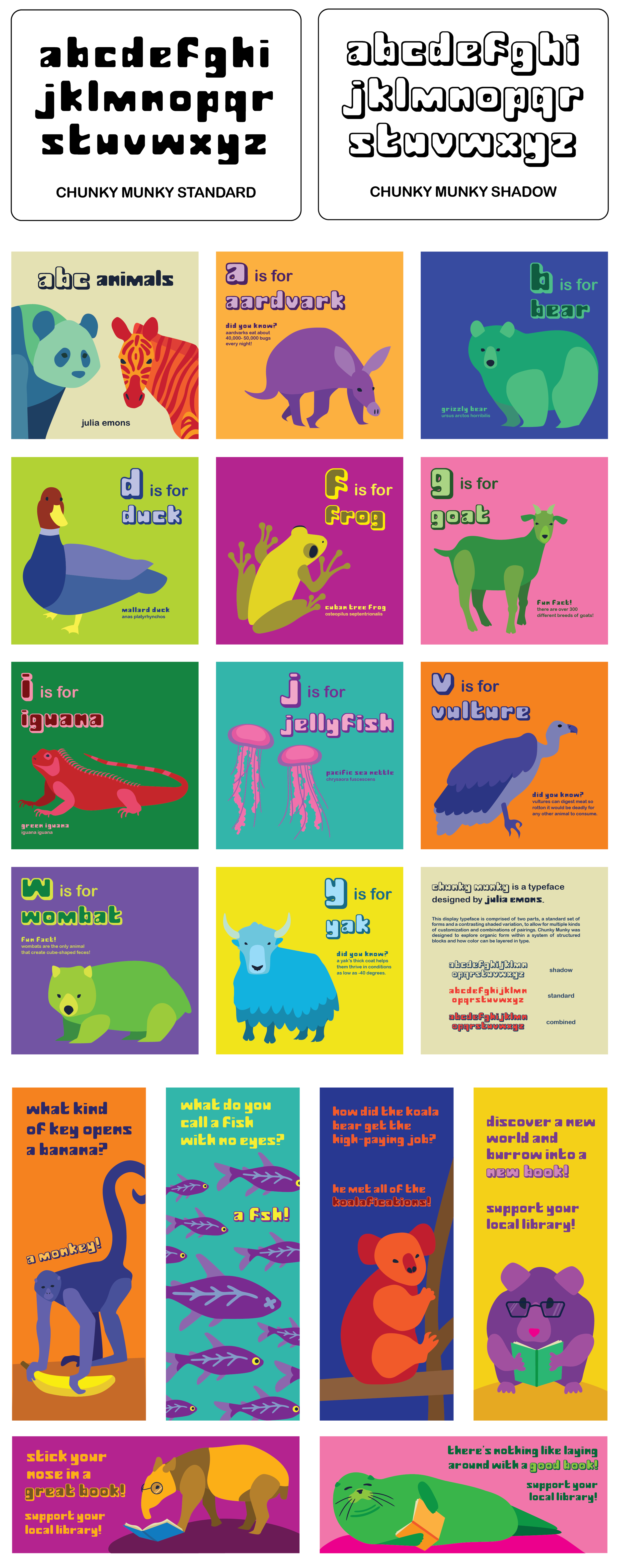 The type specimen for Chunky Munky includes an illustrated ABC book and a complementary bookmark series, showcasing the typeface's versatility in layering and color, and 26 original animal illustrations.
