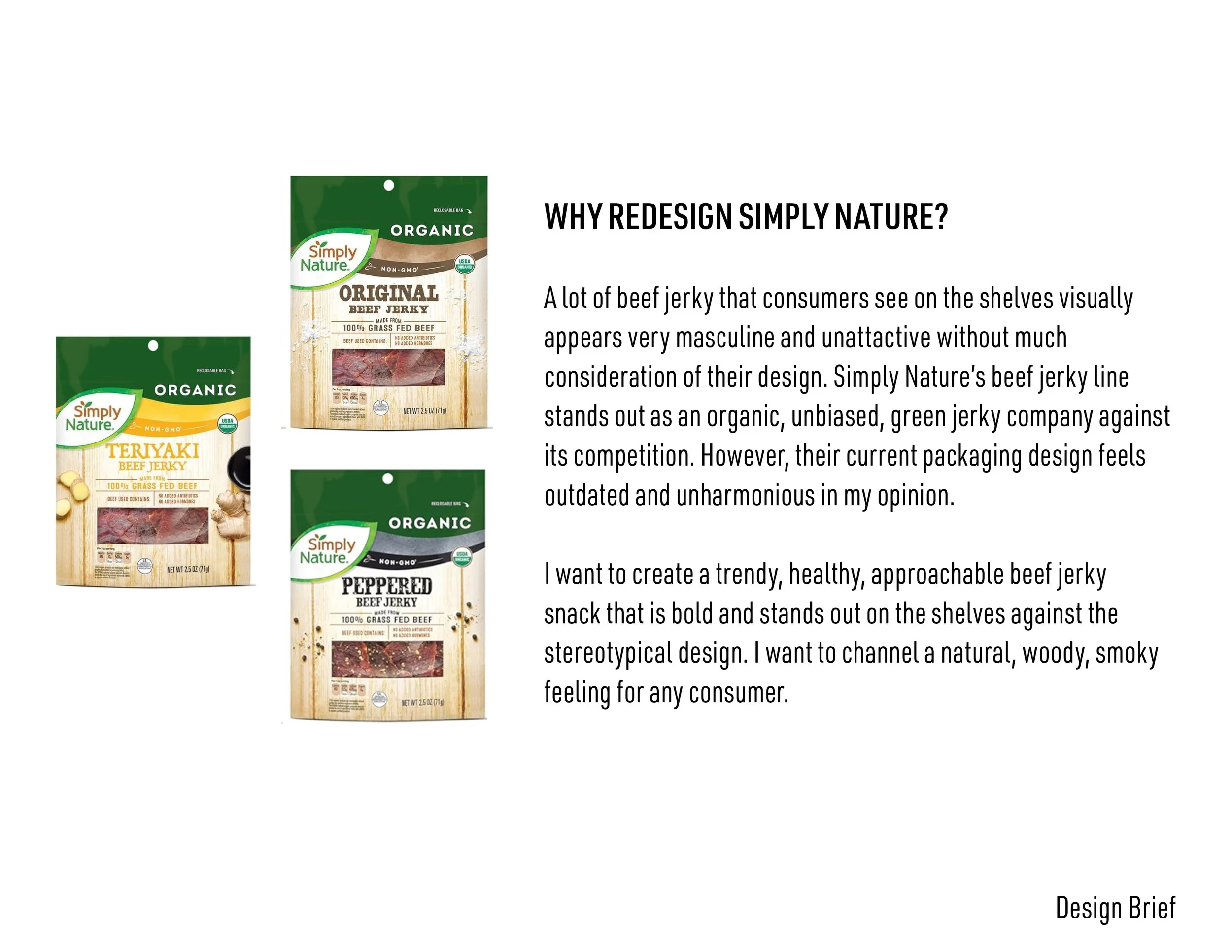 This project is a 3-piece redesign of an existing brand’s packaging. The goal is to elevate a lackluster product to be eye-catching and stand out on shelves. I chose to redesign Simply Nature’s Organic Beef Jerky brand identity and packaging.