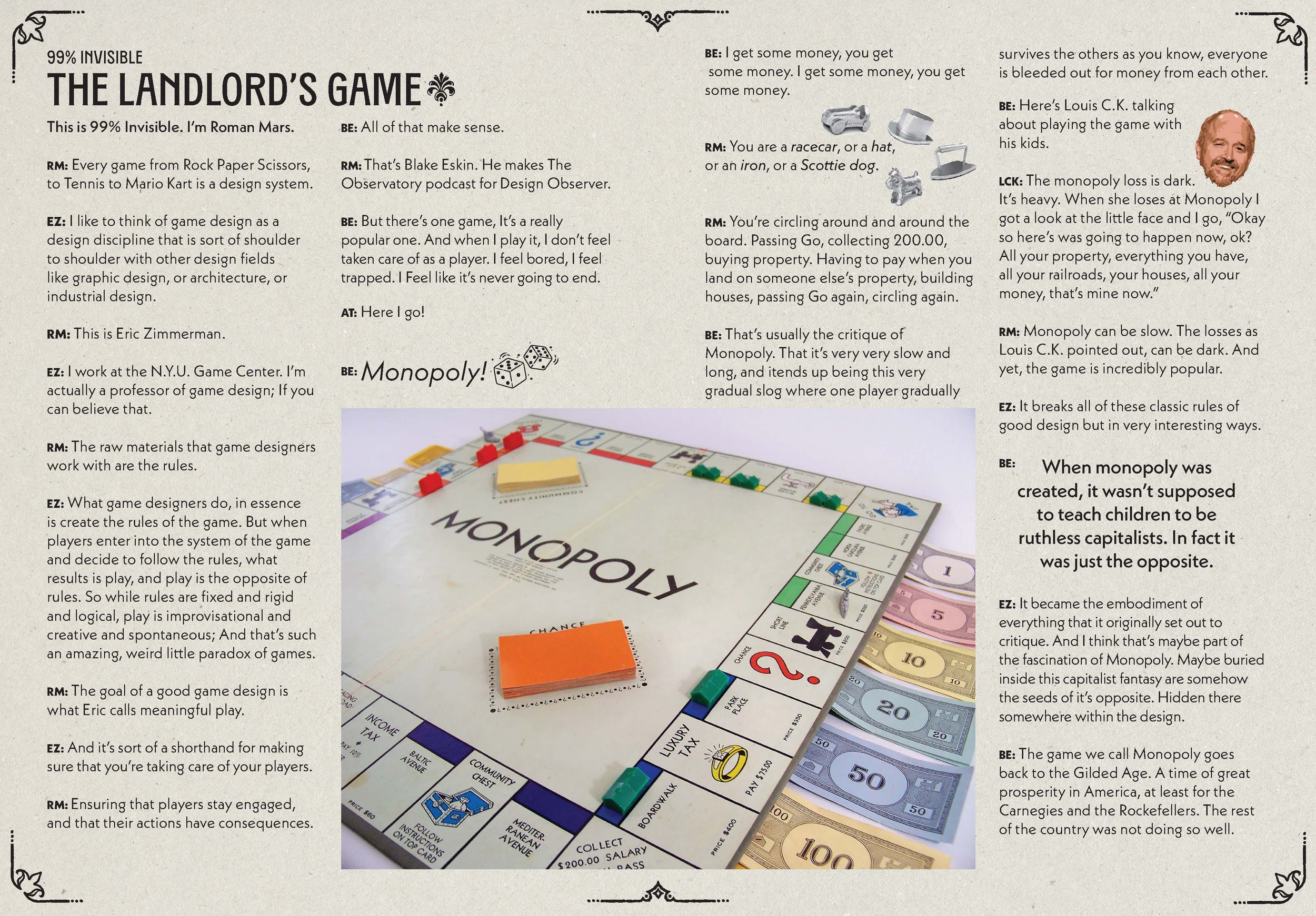 In this unique project brief I was asked to create a graphic transcript of a randomly assigned podcast episode and create a print publication based on the episode. This a transcript of Episode 189, The Landlord’s Game, of the podcast 99% Invisible that told the history of the game Monopoly.