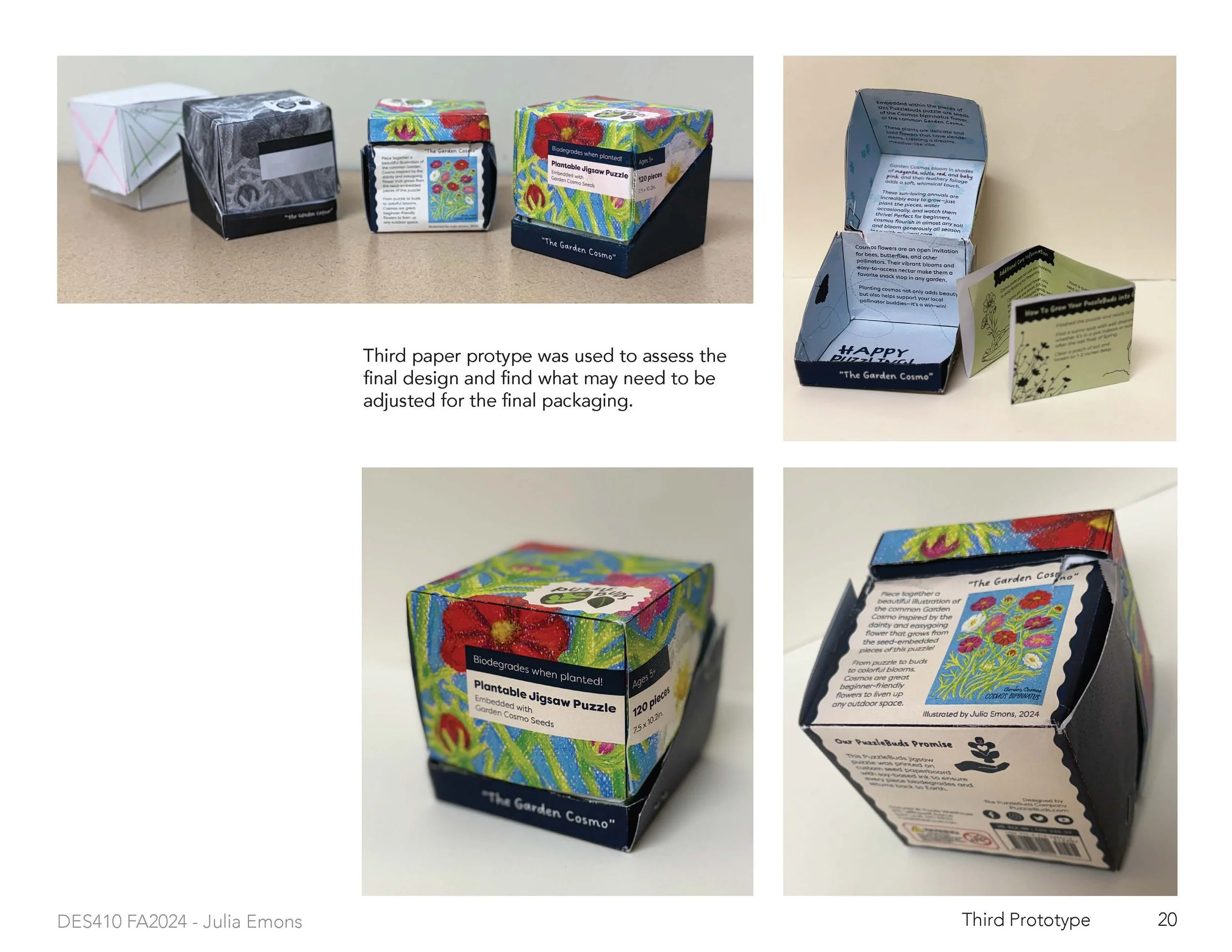 This product was created for a project brief that described unique and innovative seed packaging, outside of the standard paper pouches seeds are usually sold in. I chose to create a puzzle brand that embeds seeds into compostable puzzle pieces. Those pieces can be planted once the life cycle of the puzzle is over and bloom into the plant that the puzzle illustrates!